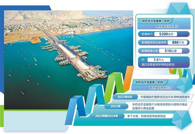 當(dāng)前正處于中巴經(jīng)濟(jì)走廊建設(shè)的第二階段,這也是至關(guān)重要的高質(zhì)量發(fā)展新階段。中巴雙方在走廊框架下,進(jìn)一步加強(qiáng)巴國(guó)工業(yè)化進(jìn)程、人力資源培訓(xùn)和產(chǎn)業(yè)園區(qū)建設(shè),在扶貧、醫(yī)療、農(nóng)業(yè)以及互聯(lián)網(wǎng)等眾多與民生息息相關(guān)的領(lǐng)域持續(xù)深化合作,力求創(chuàng)造更多就業(yè)機(jī)會(huì),不斷推動(dòng)巴基斯坦的經(jīng)濟(jì)和社會(huì)現(xiàn)代化發(fā)展,造福當(dāng)?shù)孛癖姟?022年6月,中國(guó)援助巴基斯坦瓜達(dá)爾東灣快速路通車(chē),打通了瓜達(dá)爾港和卡拉奇之間的交通運(yùn)輸通道。同年,中巴經(jīng)濟(jì)走廊首個(gè)水電投資項(xiàng)目——卡洛特水電站全面投入商業(yè)運(yùn)營(yíng),每年將向巴基斯坦提供32億千瓦時(shí)廉價(jià)清潔電能,滿(mǎn)足當(dāng)?shù)?00萬(wàn)人用電需求,每年可節(jié)約標(biāo)準(zhǔn)煤約140萬(wàn)噸,減少二氧化碳排放350萬(wàn)噸。今明兩年,走廊框架下的多個(gè)水電、風(fēng)電項(xiàng)目將陸續(xù)投運(yùn),未來(lái)巴基斯坦在清潔能源領(lǐng)域大有可為。