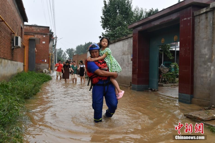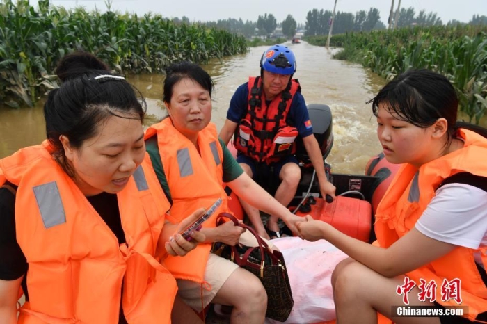 8月3日,藍天救援隊隊員在河北省涿州市刁窩鎮(zhèn)東馮村轉(zhuǎn)移村民。據(jù)該村村民介紹,當日村里水位相比昨日有所下降,村中還有部分老人和孩子。經(jīng)過一上午救援,十余名村民被轉(zhuǎn)移到安全地帶。中新社記者 翟羽佳 攝