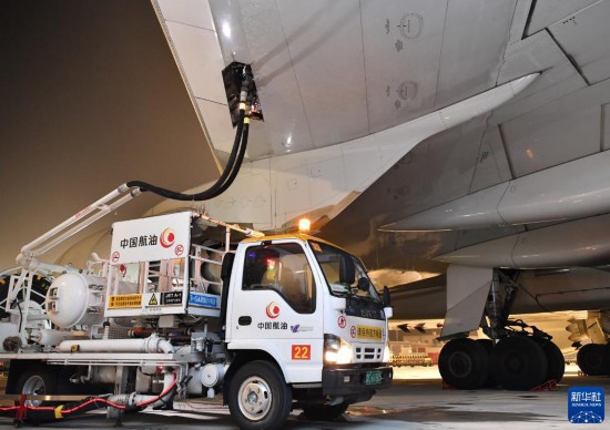 8月1日,在中國鄭州新鄭國際機場,中國航油華南藍(lán)天河南分公司的工作人員為一架盧森堡貨航貨機加油。新華社記者 李嘉南 攝