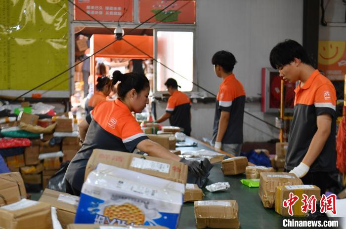 8月9日,在涿州市一家快遞公司,工作人員分揀來自轉(zhuǎn)運中心的快件。 中新社記者 韓冰 攝