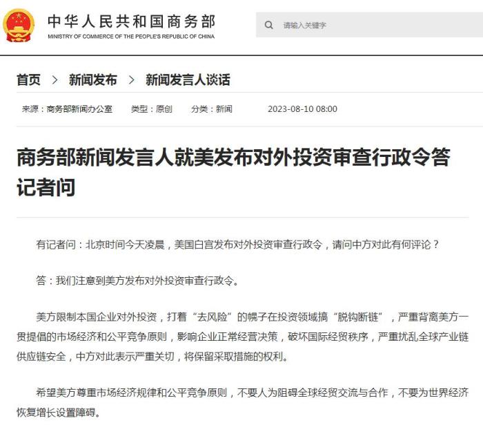 中國商務(wù)部新聞發(fā)言人8月10回應(yīng)稱,美方限制本國企業(yè)對外投資,打著“去風(fēng)險”的幌子在投資領(lǐng)域搞“脫鉤斷鏈”,嚴(yán)重背離美方一貫提倡的市場經(jīng)濟(jì)和公平競爭原則,影響企業(yè)正常經(jīng)營決策,破壞國際經(jīng)貿(mào)秩序,嚴(yán)重擾亂全球產(chǎn)業(yè)鏈供應(yīng)鏈安全,中方對此表示嚴(yán)重關(guān)切,將保留采取措施的權(quán)利。