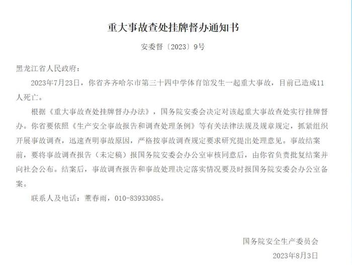 中新網(wǎng)8月14日電 據(jù)應(yīng)急管理部網(wǎng)站14日消息,國務(wù)院安委會(huì)發(fā)布重大事故查處掛牌督辦通知書。2023年7月23日,黑龍江省齊齊哈爾市第三十四中學(xué)體育館發(fā)生一起重大事故,目前已造成11人死亡。根據(jù)《重大事故查處掛牌督辦辦法》,國務(wù)院安委會(huì)決定對該起重大事故查處實(shí)行掛牌督辦。