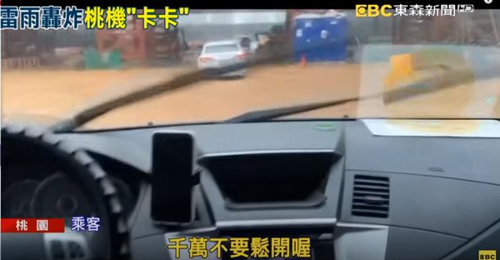 圖為臺(tái)灣桃園機(jī)場(chǎng)乘客涉水開車通過積水路面。圖片來源:臺(tái)灣東森新聞網(wǎng)視頻截圖