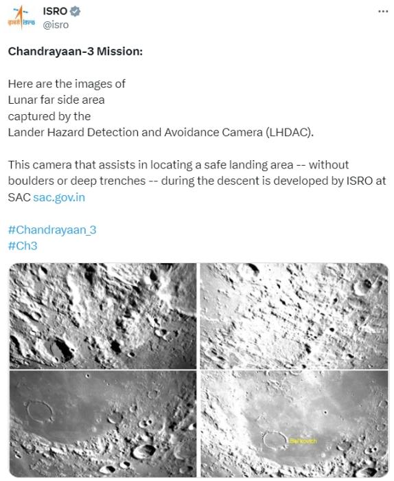 當(dāng)?shù)貢r間8月21日,ISRO在社交媒體上發(fā)布了“月船3號”上的LHDAC相機(著陸器危險探測與規(guī)避相機)拍攝的月球表面圖像。圖片來源:ISRO社交賬號截圖