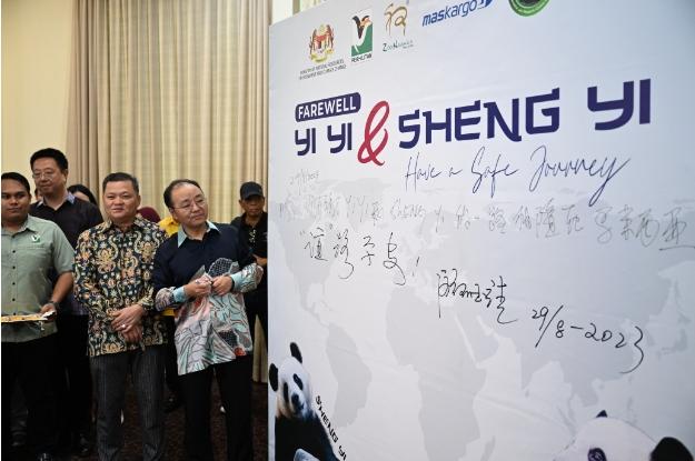 消息稱(chēng),歐陽(yáng)大使在簽名板上留言祝福兩只大熊貓“誼”路平安。范長(zhǎng)錫副部長(zhǎng)在簽名板上留言感謝“誼誼”“升誼”一路相隨在馬來(lái)西亞。