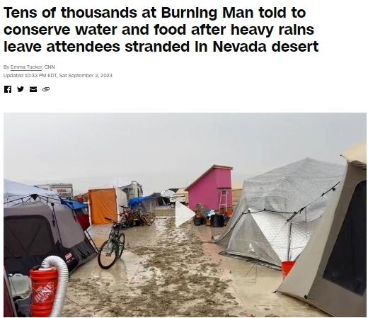 中新網(wǎng)9月3日電 據(jù)美國有線電視新聞網(wǎng)(CNN)報(bào)道,當(dāng)?shù)貢r間2日,美國內(nèi)華達(dá)州黑巖沙漠突降暴雨,數(shù)萬名到此地參加“火人節(jié)”的游客被困沙漠中。