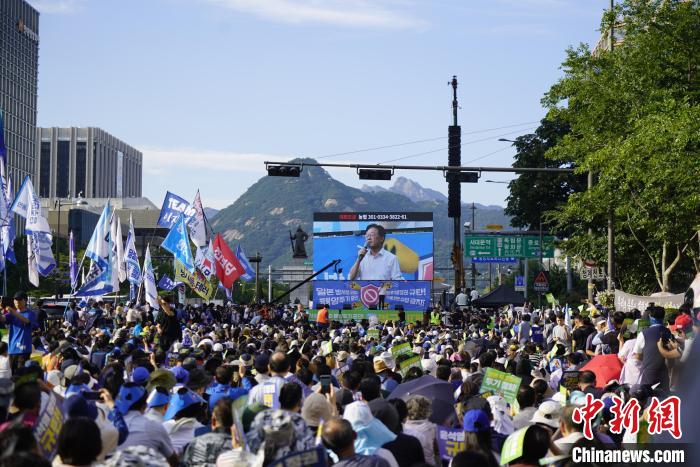 9月2日下午,韓國在野黨與市民團體在首爾市中心再次舉行大規(guī)模集會,強烈要求日本政府停止福島核污染水排海行為。圖為集會現(xiàn)場?!≈行律缬浾?劉旭 攝