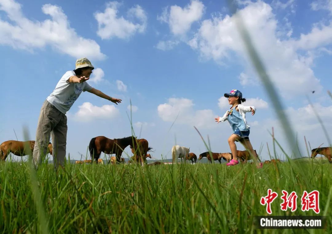 2016年8月,祖孫倆在塞罕壩機械林場內玩耍。在半個多世紀的時間里,塞罕壩人將昔日飛鳥不棲、黃沙遮天的荒原,變成百萬畝人工林海。楊可佳 攝