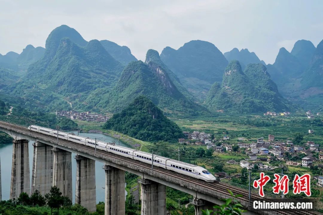 2019年5月,一列動車穿越位于廣西陽朔縣興坪鎮(zhèn)內的幸福源特大橋。陳冠言 攝