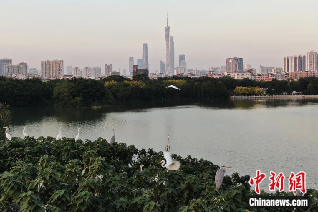 2021年11月,白鷺、蒼鷺等鳥類在廣東省廣州市的海珠湖鳥島上停歇。陳楚紅 攝