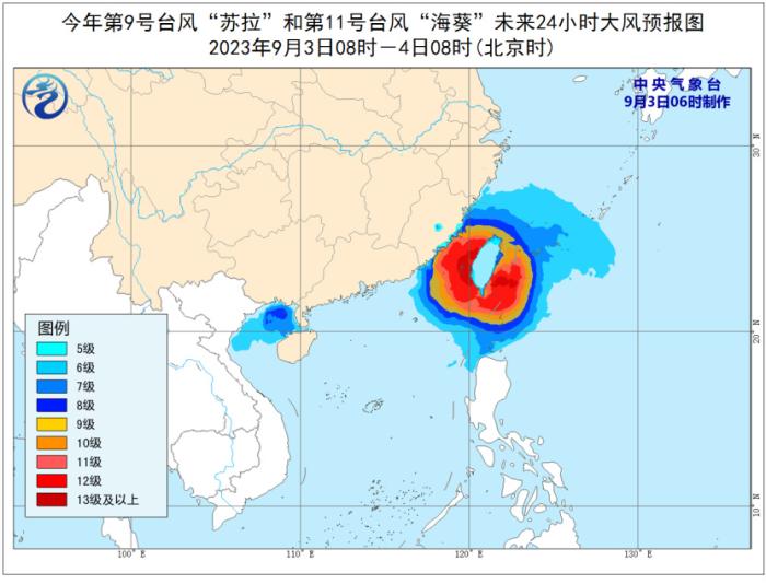 9月3日08時至4日08時,受“海葵”影響,巴士海峽、臺灣海峽、臺灣以東洋面、東海南部及釣魚島附近海域以及浙江南部沿海、福建沿海、臺灣島沿海將有6-8級、陣風9-10級大風,部分海域或地區(qū)的風力有9-12級,陣風13-14級,“??敝行慕?jīng)過的附近海面或地區(qū)的風力有13-16級,陣風17級。
