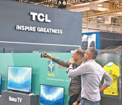 在2023年圣保羅國際消費(fèi)類電子及家用電器產(chǎn)品展覽會(huì)上,參觀者在TCL展臺(tái)前合影留念。