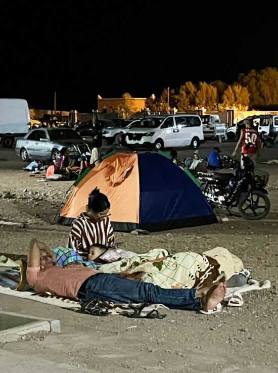 抵達(dá)目的地瓦爾扎扎特,已是9日凌晨1時(shí)左右。記者看到,許多當(dāng)?shù)孛癖娫隈R路上席地而眠。4名結(jié)伴的當(dāng)?shù)厍嗄旮嬖V記者:地震發(fā)生時(shí)大家都很害怕,紛紛來到廣場(chǎng)上,因?yàn)閾?dān)心余震,今晚就打算這樣過夜了。