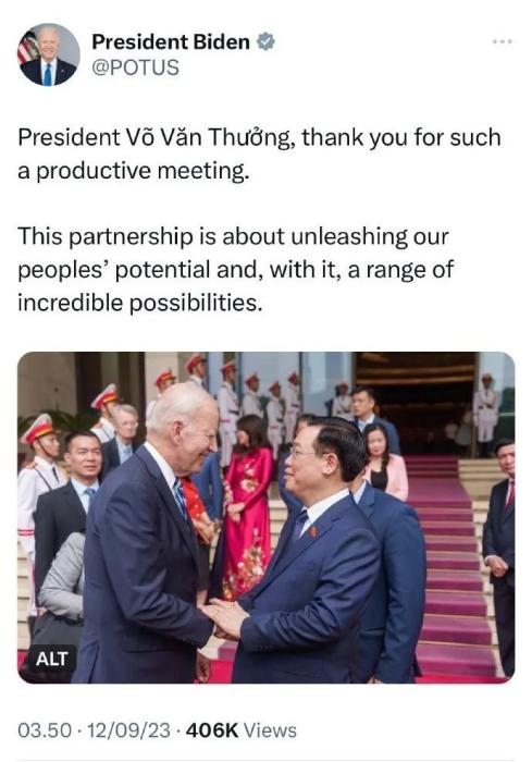 在這條發(fā)布在美國總統(tǒng)官方賬號上的帖子里,拜登為“富有成效的會議”向武文賞(Vo Van Thuong)表示感謝。然而,配發(fā)的圖片中并沒有出現(xiàn)武文賞,而是放了拜登和越南國會主席王庭惠(Vuong Dinh Hue)握手的照片。這條帖子目前已被刪除。