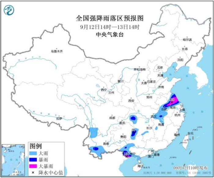 預(yù)計(jì),9月12日14時(shí)至13日14時(shí),江蘇中部、安徽中部、湖北東南部和西南部、江西北部、湖南西部、貴州東南部、云南西北部和南部、廣西西部和南部等地部分地區(qū)有大到暴雨,其中,江蘇中部、安徽中部偏東地區(qū)、廣西南部等地部分地區(qū)有大暴雨(100~160毫米);上述地區(qū)最大小時(shí)降雨量30~50毫米,局地可超過(guò)60毫米,局地還有雷暴大風(fēng)等強(qiáng)對(duì)流天氣。