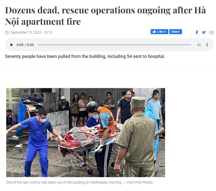 《越南新聞報》稱,目前大火已被撲滅,救援工作仍在進行當中。