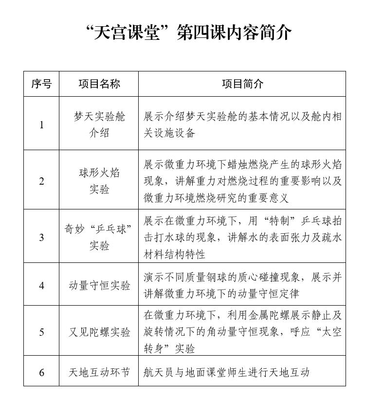 本次太空授課活動繼續(xù)采取天地互動方式進(jìn)行。3名航天員將在軌展示介紹中國空間站夢天實驗艙工作生活場景,演示球形火焰實驗、奇妙“乒乓球”實驗、動量守恒實驗以及又見陀螺實驗,并與地面課堂進(jìn)行互動交流。