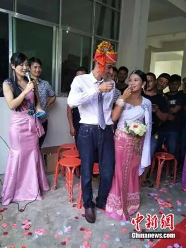 圖為2017年,景邁山傣族姑娘玉擺與法國小伙威廉喜結(jié)良緣。鐘欣 攝