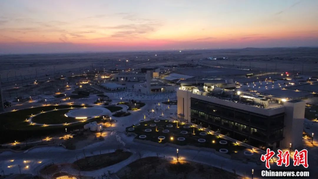 中鐵十八局集團(tuán)承建的沙特薩拉曼國王能源城項目行政樓、禮堂、醫(yī)院等五棟建筑及附屬工程燈光效果。(2022年11月拍攝)杜林 攝
