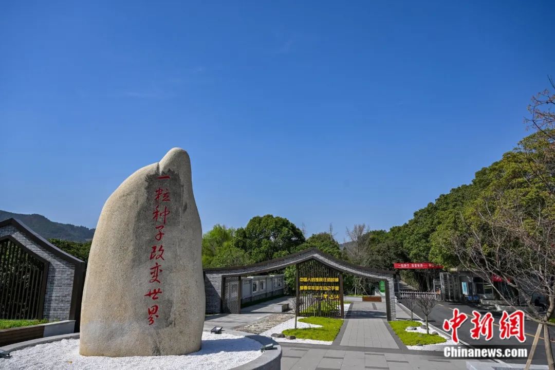 一顆標(biāo)有“一粒種子 改變世界”紅色大字的稻米石頭高高聳立在安江農(nóng)校紀念園門口。潘雨 攝
