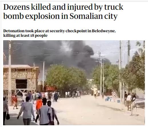 中新網9月24日電 據英國《衛(wèi)報》報道,索馬里當局表示,當地時間23日,位于索馬里中部城鎮(zhèn)貝萊德文的一個安全檢查站發(fā)生爆炸,造成至少18人身亡、40人受傷。