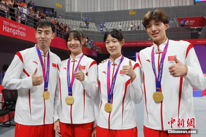 9月25日晚,杭州第19屆亞運(yùn)會(huì)跆拳道競(jìng)技混合團(tuán)體賽決賽在臨安體育文化會(huì)展中心體育館舉行。中國隊(duì)以84比77戰(zhàn)勝韓國隊(duì),獲得冠軍。圖為冠軍中國選手宋兆祥、周澤琪、宋潔、崔陽(從左至右)在頒獎(jiǎng)儀式后合影。