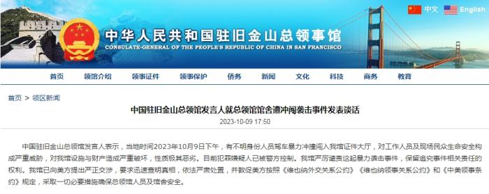 發(fā)言人稱,目前犯罪嫌疑人已被警方控制。中國駐舊金山總領(lǐng)館嚴(yán)厲譴責(zé)這起暴力襲擊事件,保留追究事件相關(guān)責(zé)任的權(quán)利。中國駐舊金山總領(lǐng)館已向美方提出嚴(yán)正交涉,要求迅速查明真相,依法嚴(yán)肅處置,并敦促美方按照《維也納外交關(guān)系公約》《維也納領(lǐng)事關(guān)系公約》和《中美領(lǐng)事條約》規(guī)定,采取一切必要措施確保總領(lǐng)館人員及館舍安全。