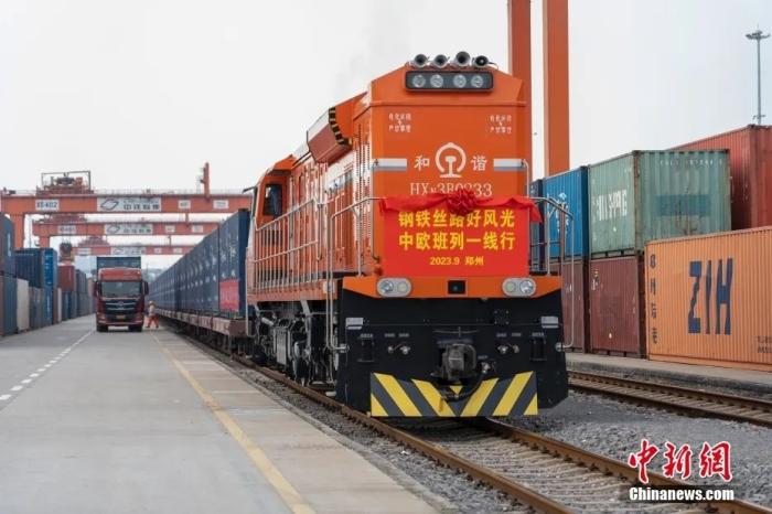 2023年9月17日,河南鄭州,一列滿載醫(yī)療器械、汽車配件等貨物的中歐班列(鄭州)從中國(guó)鐵路鄭州局集團(tuán)有限公司圃田車站駛出,將經(jīng)中國(guó)二連浩特開(kāi)往德國(guó)漢堡。