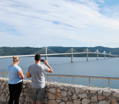 沿著克羅地亞狹長(zhǎng)的海岸線(xiàn)一路向南行駛到科馬爾納地區(qū),遠(yuǎn)遠(yuǎn)就能望見(jiàn)如銀鏈般橫臥在山海之間的佩列沙茨大橋。在橋頭一側(cè)的休息區(qū),人們紛紛停下車(chē)來(lái),對(duì)著大橋拍照留念。來(lái)自克羅地亞北部的卡塞爾和朋友們特地自駕來(lái)到這里,開(kāi)心地請(qǐng)本報(bào)記者幫忙合影?!芭辶猩炒拇髽蜻B通了克羅地亞南北領(lǐng)土,是我們心中最美的大橋!”卡塞爾說(shuō)。