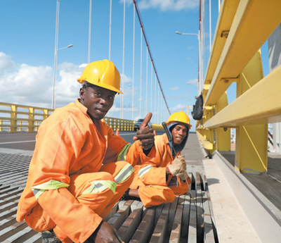 據(jù)介紹,馬普托大橋項(xiàng)目在建設(shè)過(guò)程中踐行屬地化經(jīng)營(yíng)理念,建設(shè)最高峰期雇傭當(dāng)?shù)貑T工超過(guò)3000人,焊工、車(chē)工、鋼筋工、機(jī)械操作手等一大批專(zhuān)業(yè)技術(shù)人員通過(guò)大橋項(xiàng)目提升了職業(yè)技能?!霸诖髽蝽?xiàng)目上學(xué)到的一技之長(zhǎng)幫我找到了新的工作?!蹦1瓤饲嗄攴茽柕缕湛ㄕ劶霸隈R普托大橋項(xiàng)目工作的收獲,臉上洋溢著幸福的笑容。