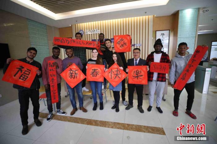資料圖:2019年2月3日是中國農(nóng)歷臘月二十九,“春節(jié)”將至,來自巴基斯坦、烏茲別克斯坦、烏克蘭等國家和地區(qū)的十余名中國石油大學的留學生在青島歡聚一堂,一起寫“春聯(lián)”、題“?!弊?、貼“窗花”,感受中華文化。中新社記者 胡耀杰 攝