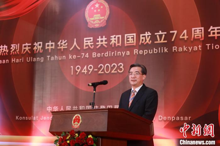 中新網(wǎng)登巴薩10月13日電 (記者 李志全 實(shí)習(xí)生 陳詩夢(mèng))10月12日晚,中國駐登巴薩總領(lǐng)館舉辦招待會(huì),熱烈慶祝中華人民共和國成立74周年。中國駐登巴薩總領(lǐng)事朱興龍出席并致辭。巴厘省省長(zhǎng)代表蘇拉加、旅游局局長(zhǎng)巴古斯、伍拉萊移民局局長(zhǎng)蘇亨德拉、交通局局長(zhǎng)葛德、文化局局長(zhǎng)阿亞等政要,宗教、行業(yè)協(xié)會(huì)、外國駐巴厘島總領(lǐng)事等各界友人以及中資企業(yè)、華僑華人、漢語教師代表等300余人出席。