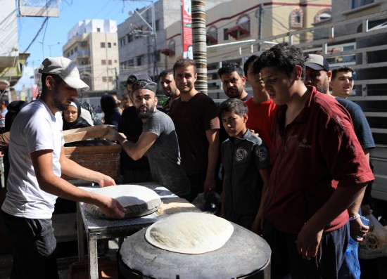 10月15日,在加沙地帶南部地區(qū),流離失所者排隊(duì)購買大餅。新華社發(fā)(亞西爾·庫迪攝)