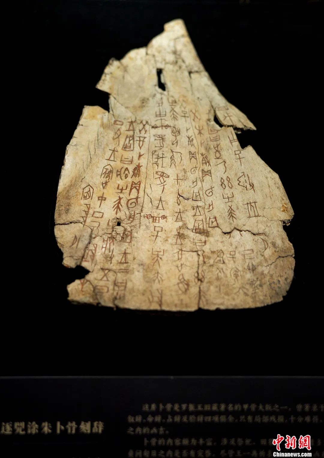 資料圖:位于北京的國(guó)家博物館內(nèi)的“證古澤今——甲骨文文化展”展出的“王賓中丁·王往逐兕涂朱卜骨刻辭”卜骨。侯宇 攝