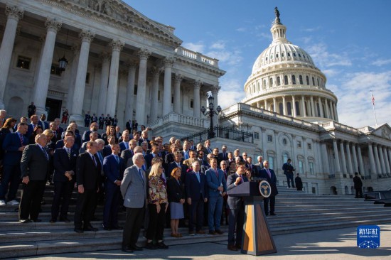 10月25日,在美國華盛頓國會,新當選的眾議院議長邁克·約翰遜(后右)發(fā)表講話。新華社發(fā)(亞倫攝)