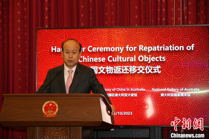 當(dāng)?shù)貢r(shí)間10月25日上午,經(jīng)中國國家文物局授權(quán),中國駐澳大利亞大使館在堪培拉舉行儀式,接收澳方向中國返還共4件流失文物藝術(shù)品與1件古生物化石。中國駐澳大利亞大使肖千在致辭中表示,這些文物回歸祖國,顯示了中澳兩國政府對(duì)于保護(hù)文化遺產(chǎn)的共同承諾,是雙方文化遺產(chǎn)交流的一次盛事和友好合作的見證。 中新社記者 顧時(shí)宏 攝