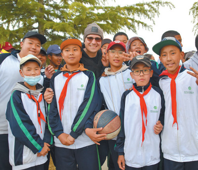 2023年5月,中國外文局語言顧問拉斐爾(中)在西藏拉薩與當地學生合影留念。