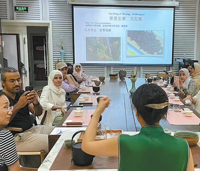 2023年7月,沙特中文學習者那丹(左三)在北京語言大學體驗中國茶文化。