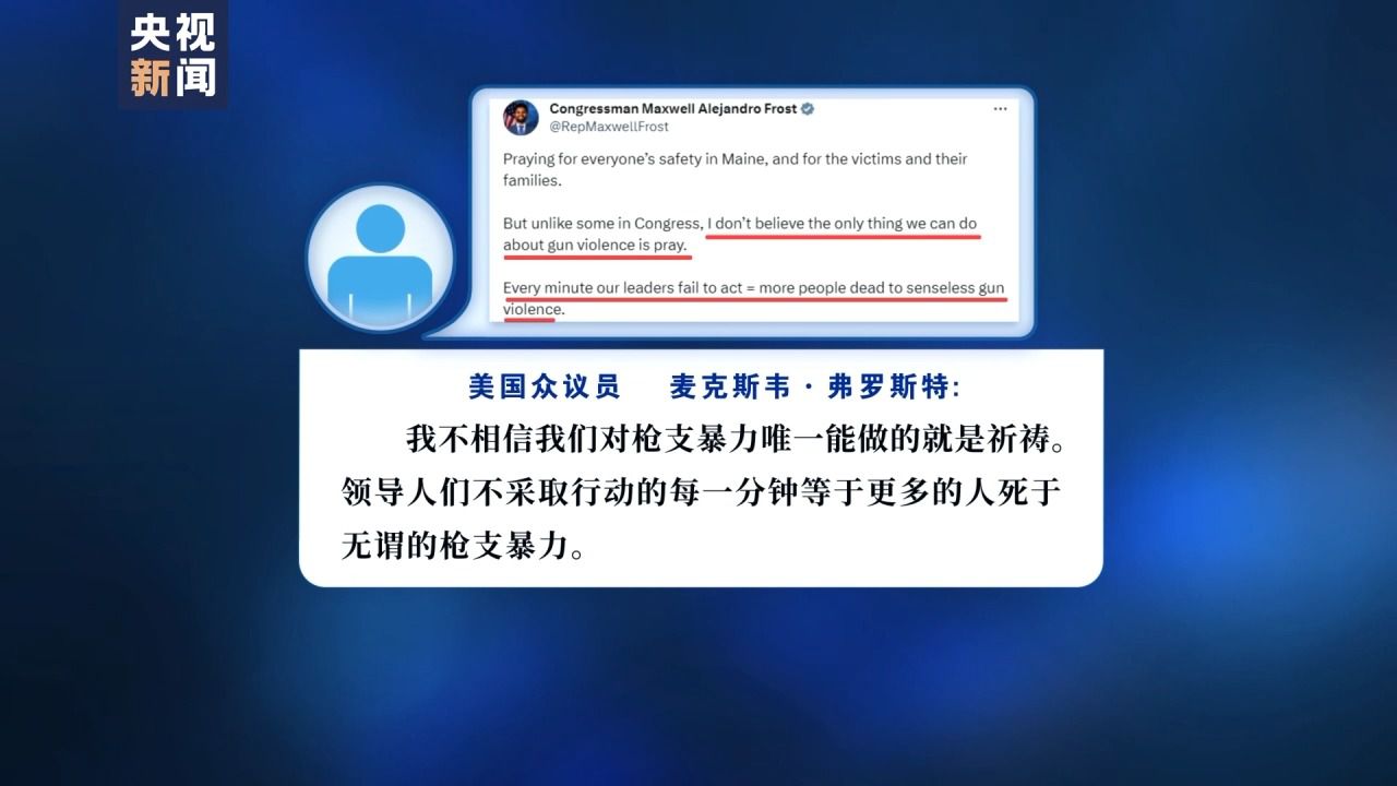 此外,每次槍擊案發(fā)生后,美國擁槍派政客都重復(fù)著空洞的安慰,這次也不例外。在多位擁槍派政客的社交媒體上,各種口頭安慰和無力的陳詞濫調(diào)比比皆是。對此,美國眾議員麥克斯韋·弗羅斯特(Maxwell Alejandro Frost)發(fā)推文寫道,“我不相信我們對槍支暴力唯一能做的就是祈禱。領(lǐng)導(dǎo)人們不采取行動(dòng)的每一分鐘等于更多的人死于無謂的槍支暴力。”