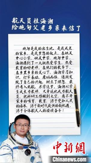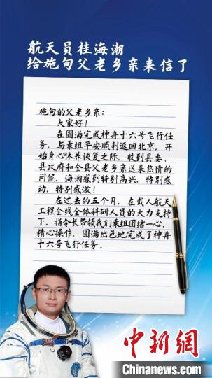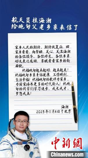 中新網(wǎng)昆明11月5日電(陳靜)記者5日從云南省保山市施甸縣委縣政府獲悉,其收到了航天員桂海潮4日從北京發(fā)來的回信,他在信中表示,感謝家鄉(xiāng)的哺育,期待恢復(fù)后,回家鄉(xiāng)看看!