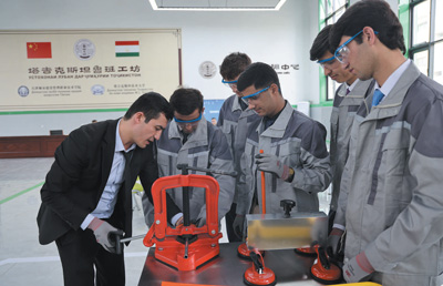 2022年,中亞地區(qū)首家魯班工坊在塔吉克斯坦啟動(dòng)運(yùn)營(yíng),為塔吉克斯坦開(kāi)展職業(yè)培訓(xùn)作出了積極貢獻(xiàn)。圖為今年4月,在塔吉克斯坦魯班工坊,塔方教授向?qū)W生介紹中方捐贈(zèng)的設(shè)備。