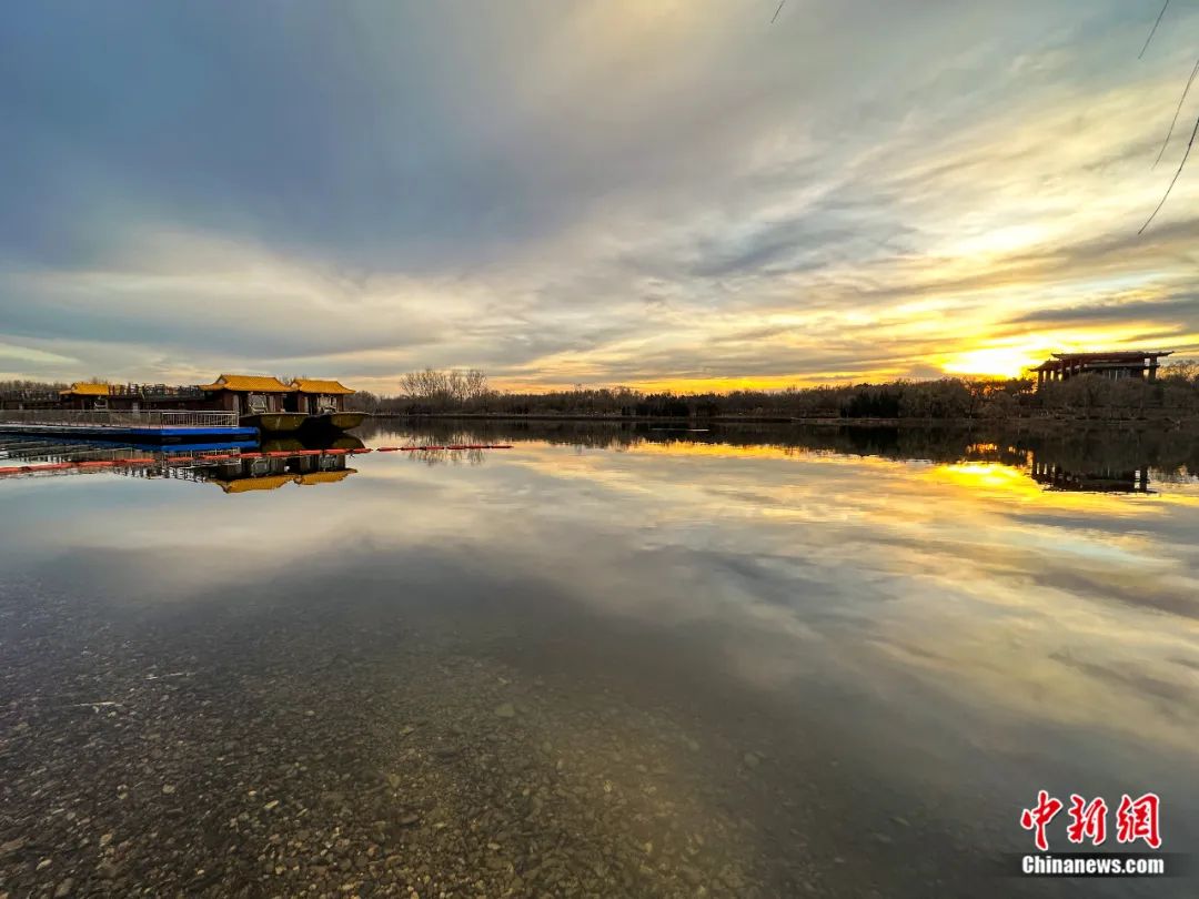 2022年12月11日,夕陽(yáng)映照大運(yùn)河,北京通州大運(yùn)河森林公園里落日余暉映晚霞,一抹夕陽(yáng)美如畫(huà)。王丹楓 攝