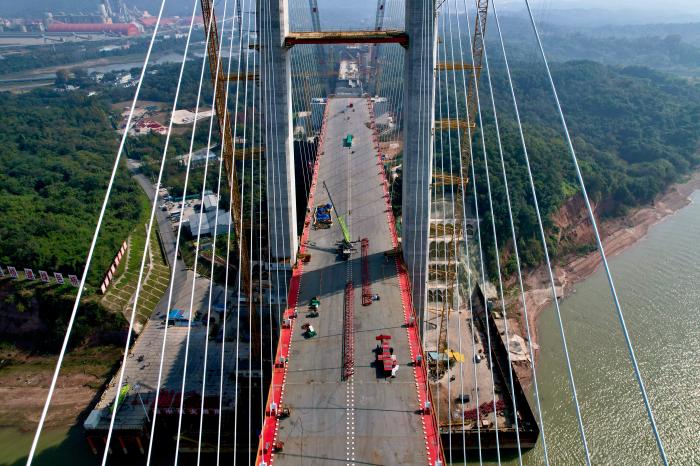 斜拉和懸索組合,強(qiáng)強(qiáng)聯(lián)合,牢固度加倍。大橋采用的這種構(gòu)建形態(tài),有效減少了江中橋墩對航運(yùn)的影響。中鐵大橋局項(xiàng)目部黨工委副書記張馳對中新網(wǎng)記者介紹,這種設(shè)計(jì)的優(yōu)點(diǎn)是跨度大、剛性強(qiáng)、成本低,未來將被廣泛采納和使用。