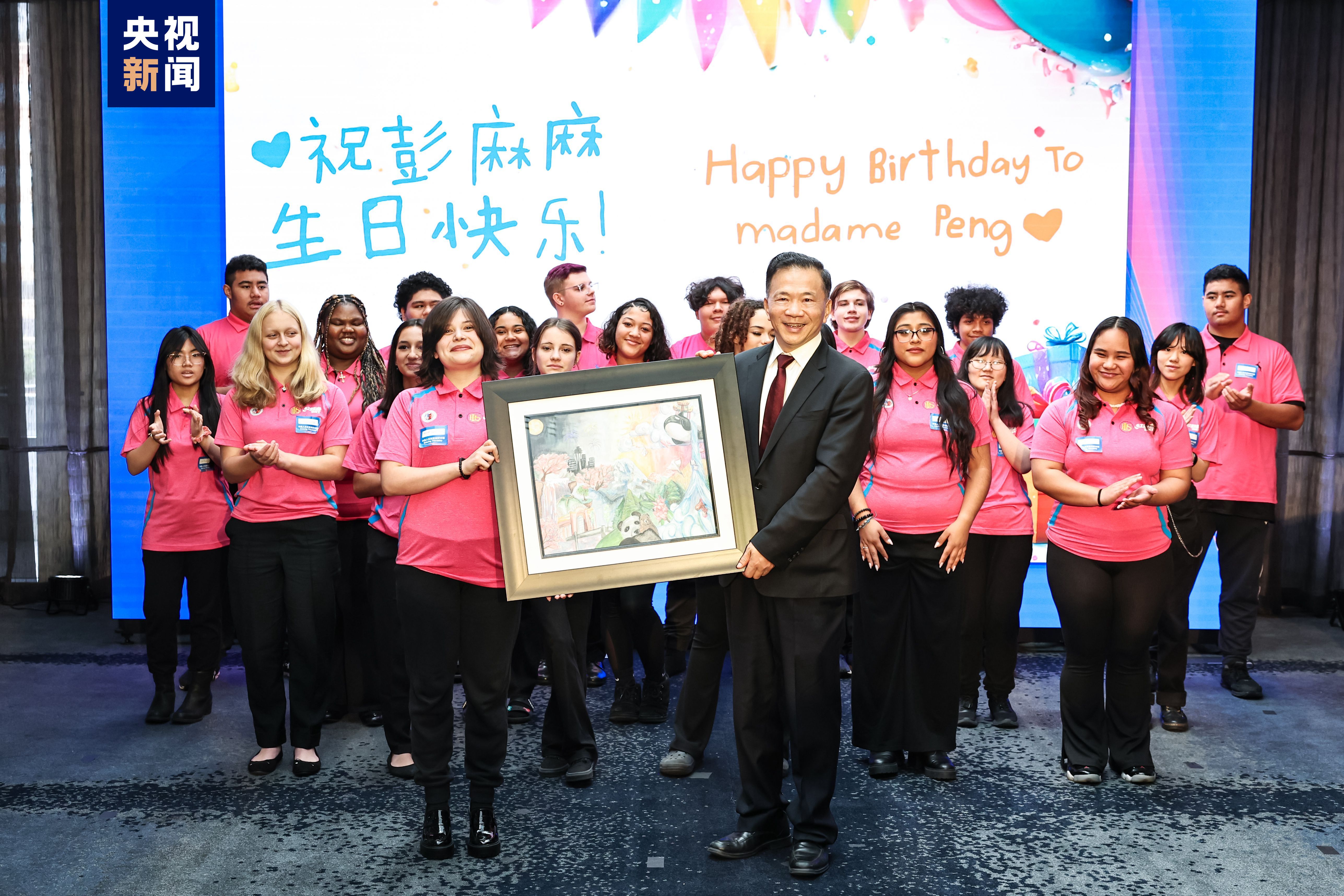 活動現(xiàn)場,來自華盛頓州林肯中學(xué)的合唱團演唱了中文歌曲《在希望的田野上》和英文歌曲《伴我同行》,祝愿中美友誼的紐帶更加牢固,煥發(fā)新的活力。同學(xué)們還為習(xí)近平主席和夫人彭麗媛精心準(zhǔn)備了手繪畫作《一起向未來》,并用精美的生日賀卡和《生日快樂》歌親切地為“彭麻麻”送上了生日祝福。總臺臺長代為接收。