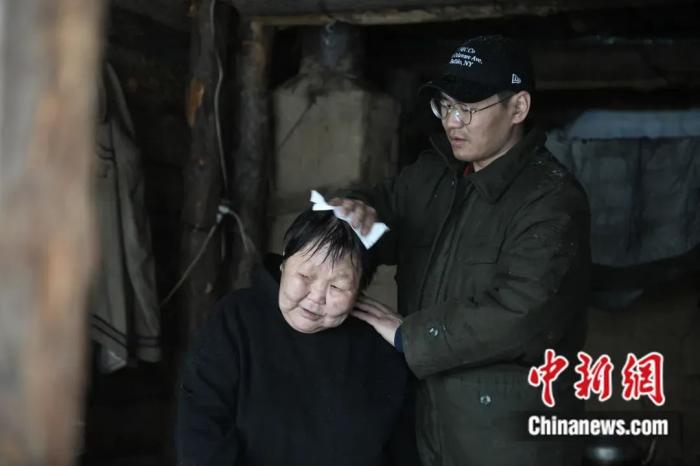 柳霞的兒子雨果為母親擦拭被雪打濕的頭發(fā)。王偉 攝