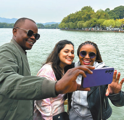10月13日,代表團(tuán)成員在浙江省杭州市西湖景區(qū)合影留念。