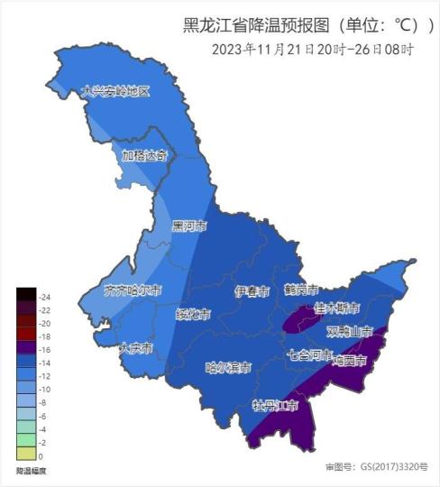 黑龍江省2023年11月21日20時至26日8時降溫預(yù)報圖。黑龍江省氣象局供圖