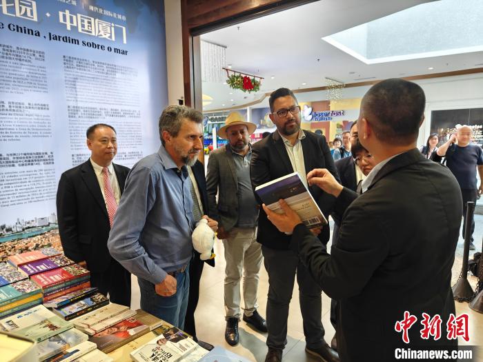 廈門外圖集團(tuán)有限公司工作人員向巴西伊瓜蘇議長(zhǎng)莫拉雷斯(右二)介紹中文書(shū)籍。廈門市宣傳部供圖