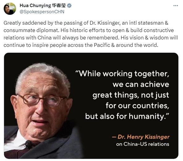 華春瑩寫道,“我對基辛格博士的逝世深感悲痛,他是一位國際政治家和杰出的外交家。我們將永遠銘記他為開拓和建立同中國的建設(shè)性關(guān)系所作的歷史性努力。他的遠見和智慧將繼續(xù)激勵太平洋地區(qū)乃至世界各地的人們。”