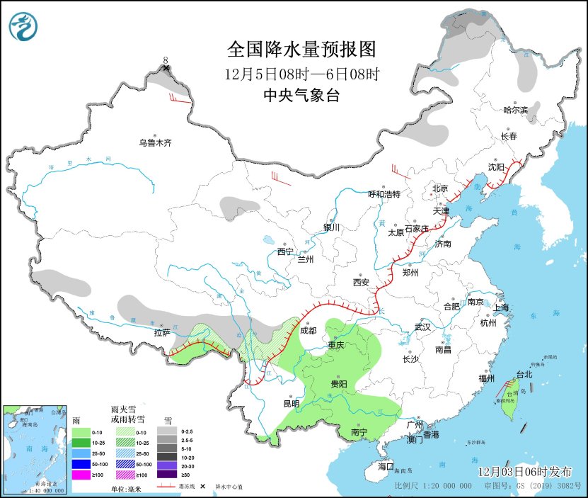 全國(guó)降水量預(yù)報(bào)圖(12月5日08時(shí)-6日08時(shí))